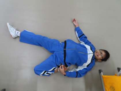 I組は朝のトレーニングの時間です。陽菜さんは膝をつけてかかともつけて座ることが出来ます。足首が柔らかいです。両手を後ろで組んでいました。やってみてください。なかなか出来ません。絢二郎さんも仰向けで膝を曲げて股の部分のストレッチです。これも柔らかいです。(上から撮った写真です)