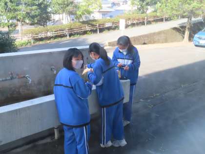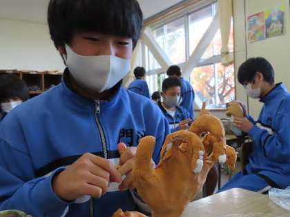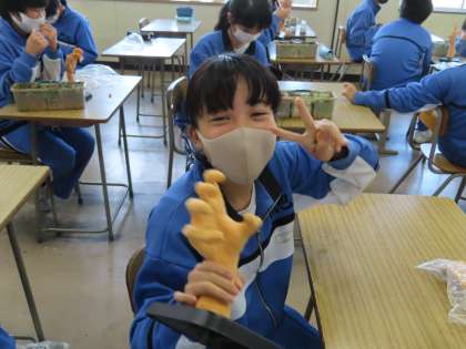 2Cの美術です。芯の形を決めて肉付けしていきます。なかなか自分の手のようにふっくらした形になりません。苦労していました。水道のところで作業している3人組です。指をぬらしながら作業をしていました。