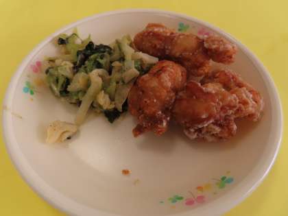 唐揚げはとてもジューシーでおいしくいただきました。ごま和えはキャベツの甘みを感じるくらいです。ごちそうさまでした。