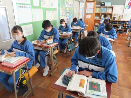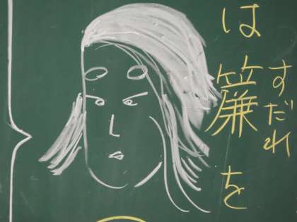 3Aは国語の授業です。「枕草子」の授業でした。中学生で誰もが経験した授業です。わかりやすく授業を進めていただくのですが、やはり難しい部分があるようです。黒板の絵は、伊藤先生作です。