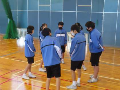 2Dの体育は体育館で行っていました。「ダンス」です。まだ始まったばかりなので男女のグループでの動き方を思案していました。