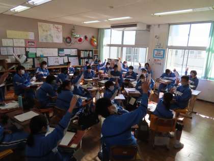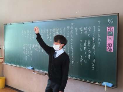 2Bの道徳は石川先生が行っていました。「一人しかいない自分」人生の目的は?を考えていく授業でした。生徒に聞きます。「神様が幸せになるために3つ願いを叶えてくれるなら何があると良い?黒板にたくさんの意見が出てきた物を書き出してあります。本当に必要かを皆で考えていきました。