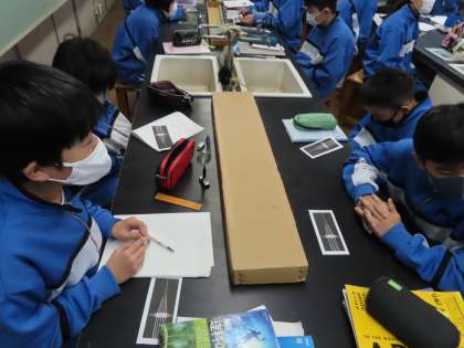 1A理科は瀧本先生が「光の進み方」の学習をしています。レンズを通った光がどのようにすすむかを学習中です。