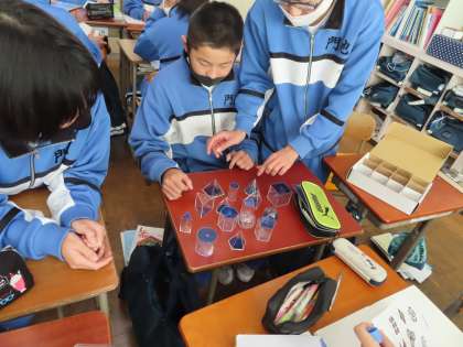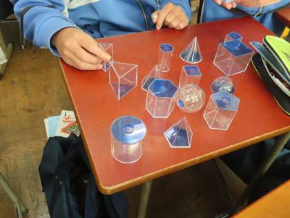 1Bの数学は「空間図形」に入りました。「今日は図形の分類をしよう」と言うことで作業に入ります。