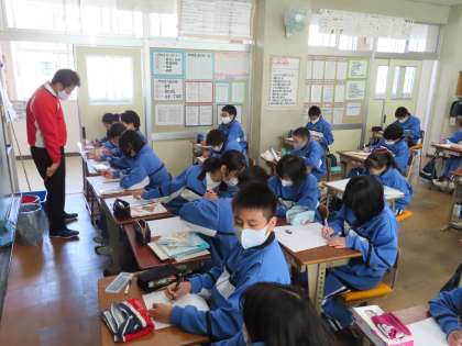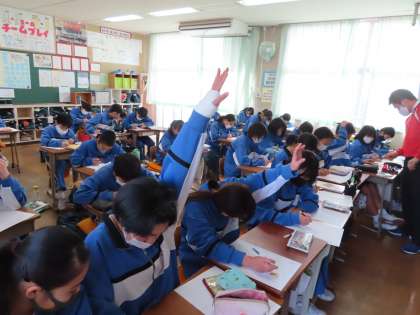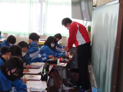 1Aは数学です。今日は2年前の学力調査の問題に挑戦しています。1月には今年の学力調査が行われるので、練習をかねての取り組みです。心配な生徒は前に集まりすぐに質問できるように並んでいました。