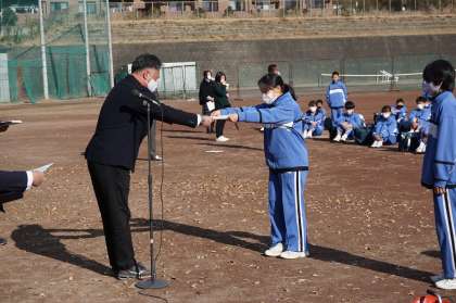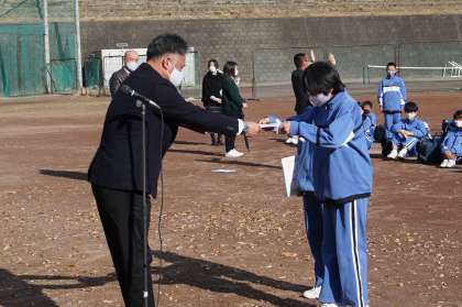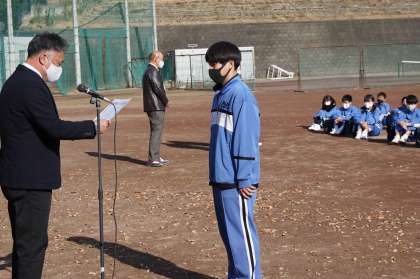 90日の2学期を締めくくる終業式を迎えました。三密を避けるため外で行いましたが、穏やかな日差しで快適に行うことができました。式に先立ち表彰を行います。男子バレー部と男女の剣道部です。