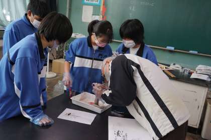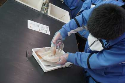 2Bは理科です。イカの解剖を行っています。食紅を溶かした液体を口から流し込んで、消化管のつながりを観察しています。手際がいいです。