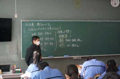 3Aは社会です。生産・商品をつくるという単元です。生産の三要素である、資本、労働力、自然(土地、資源)などについて、自分の知識や経験、学んだことなどを生かして考えています。