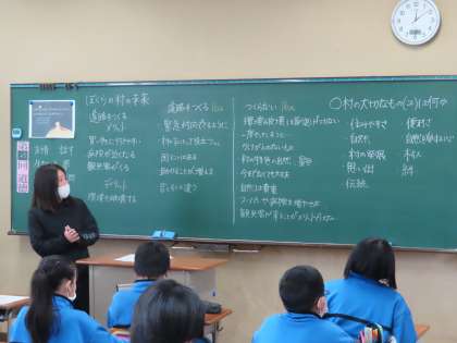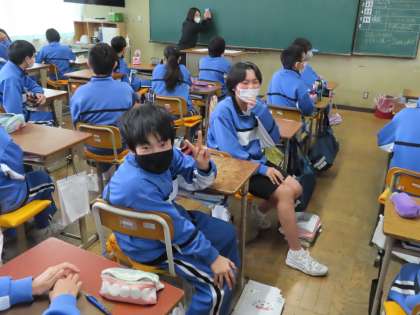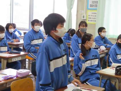 1Aの道徳は栗田先生が行っていました。「ぼくらの村の未来〜道路をつくるメリットは?」の内容です。町から遠く離れた村。もっと便利なトンネルの道路を作るか、自然を破壊するのはよくないから作らない。16人対16人に分かれて意見交換を行っていました。