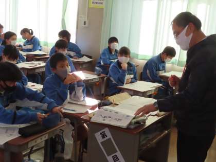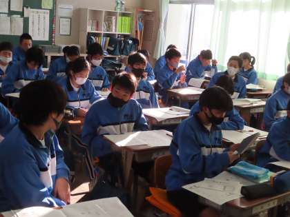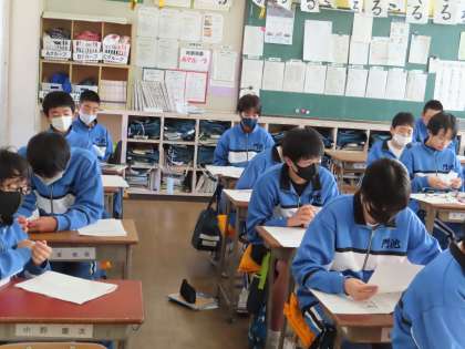 1年C組は理科です。学力調査の見直しの時間です。難しい問題も多かったようです。