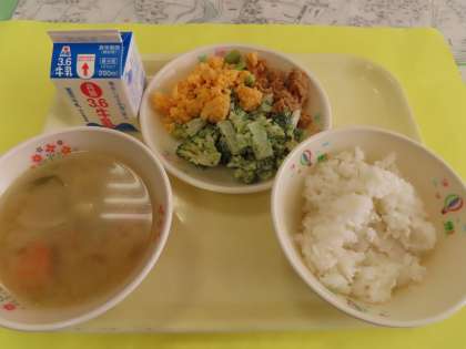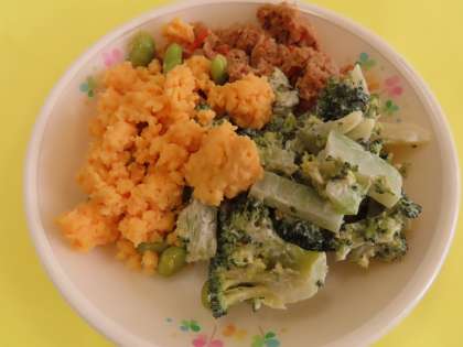 そぼろごはん、ボリュームがありました。ブロッコリーもマヨネーズで和えてあったので食べやすかったです。ごちそうさまでした。