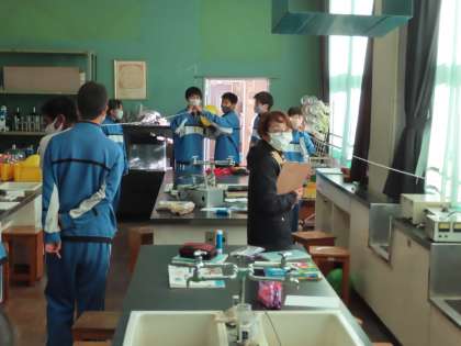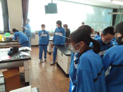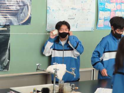 こちらでは糸電話の実験です。紐の長さが違う時の伝わりを実験しています。とても楽しそうに実験をしていました。
