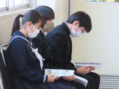 廊下には緊張した空気が漂っています。本を読みながら心を落ち着かせている生徒や自分が書いた面接カードを見返しながら最終チェックをしている生徒など様々です。