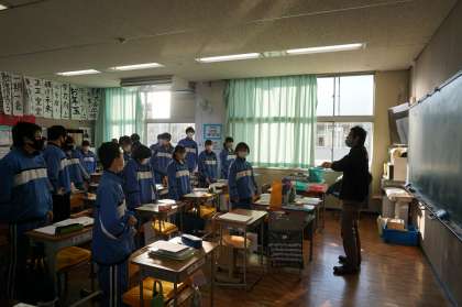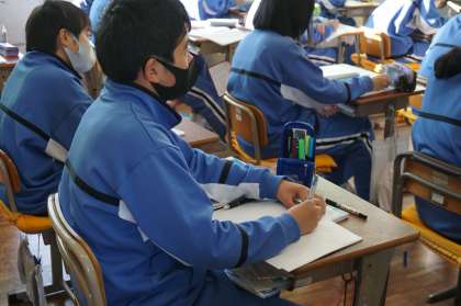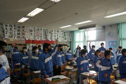 2Aは数学です。確率の授業に入りました。まずは身近なところにあるトランプやサイコロなどを使って、確率のイメージをつかんでいきます。コインの裏表を当てる場面でした。3回連続裏が出たので生徒は驚いていました。