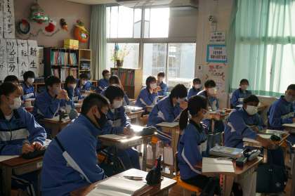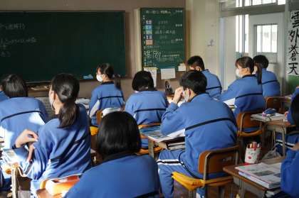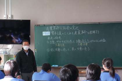 2Bは社会です。産業革命と社会の変化という単元です。500円でやきそばを売ろうとしているが、材料費などで493円かかった場合、あなたはどうするかという問いを考えています。