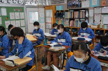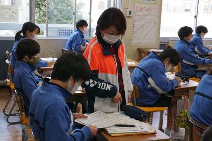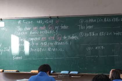 2Dは英語です。be動詞+過去分詞で表す受動態を学んでいます。過去分詞はここではじめて扱うので、まだ慣れていない様子です。ティームティーチングで加藤先生が入られています。二人の先生がいるので、生徒は質問しやすいようです。