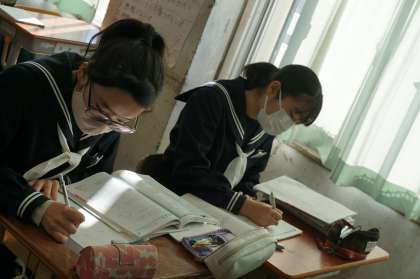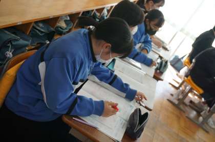 3Bは数学です。三平方の定理を使った問題を解いています。皆集中しており、誰一人話をしていません。さすが受験生です。