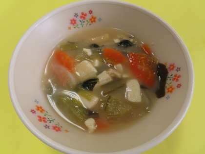 少し甘めの揚げ煮でごはんが進みます。野菜がたくさん入った味噌汁でおいしかったです。ごちそうさまでした。