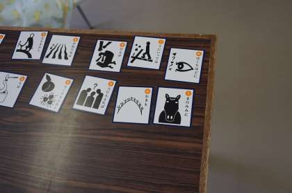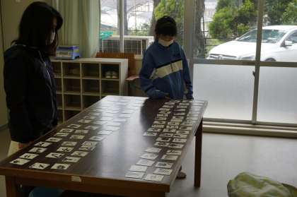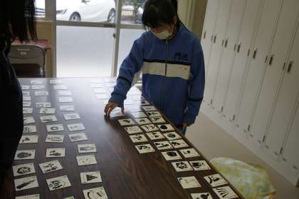 I組は、生単の時間です。今日はことわざかるたをやっていました。ことわざを前半と後半に分けたカードを並べています。ことわざの意味にもふれていきます。