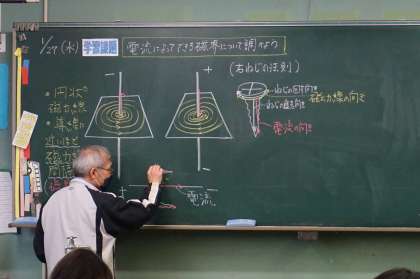 2Aは理科です。電流によってできる磁界の特徴について学んでいます。実験結果から分かった磁界の向きについてまとめています。