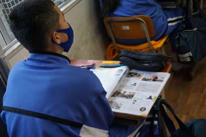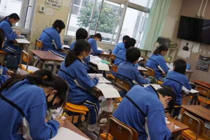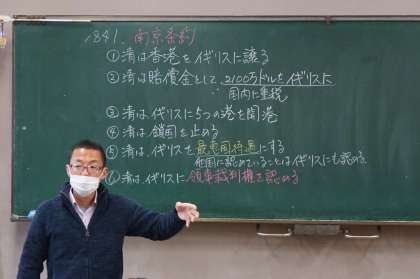 2Dは社会です。南京条約についての学習です。アヘン戦争後の清とイギリスの関係について調べていきます。領事館裁判について小学校で学んだことを確認しています。