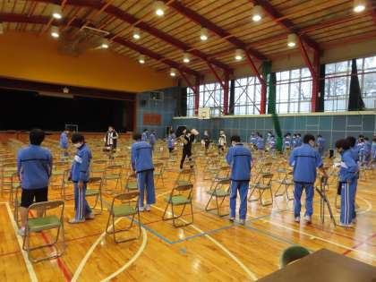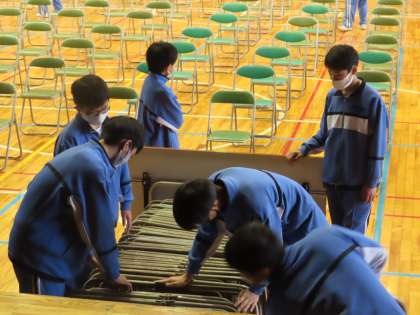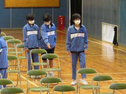 今日の午後、体育館で門池小学校6年生を招待し、新入生説明会を行います。朝登校したばかりの2年生男子が、いす並べをしてくれました。