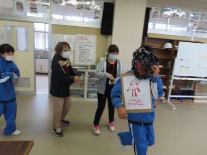 まず絢二郎さんが鬼役です。みんなで豆まきをして鬼を退治しました。鬼も上手に逃げ回っていました。最後はやられてしまいました。