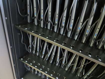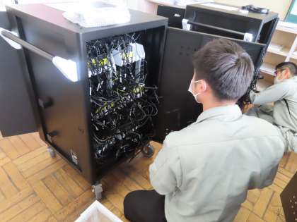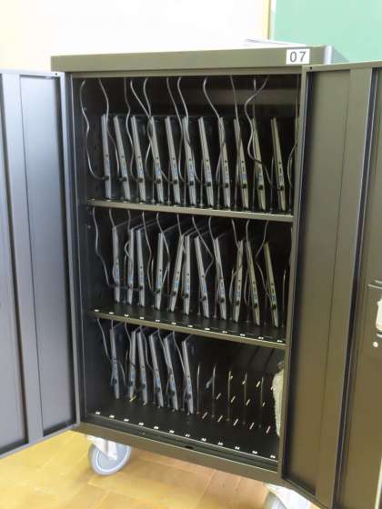 充電保管庫にコンセントをセットし、ケーブルでつなぎ充電できるようセットしていました。一台の保管庫には、ひとクラス分の端末が入ります。