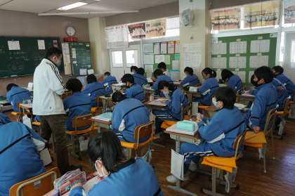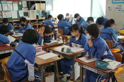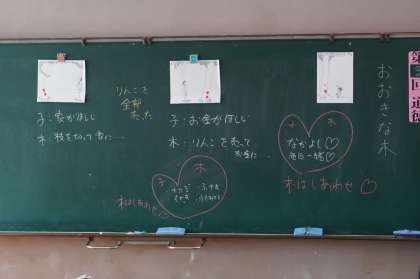 2Aは『大きな木』という資料を使っての授業です。主人公が木に向かって願い事を言うと、きはその願いを叶えようと様々なことをしています。そのことで木は幸せになるのです。「家がほしい」という願いに対して枝を切って答えようとしています。その続きのストーリーを考えています。ハッピーエンドとそうではない生徒といろいろあるようです。