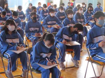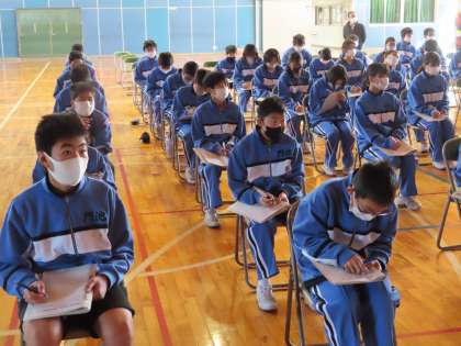 生徒は講話の内容をしっかりメモしています。まだ1年生と思わないで、真剣に自分の将来について考える良い機会となりました。
