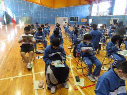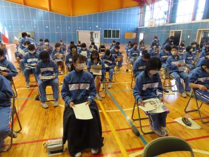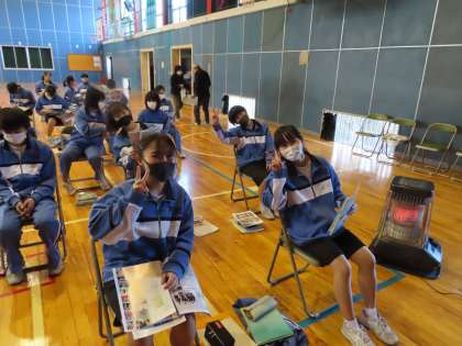 5時間目に2年生は、実業高校の先生に来校していただき学校の紹介をしていただきました。寒いので防寒着を着用している生徒もいます。