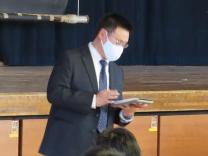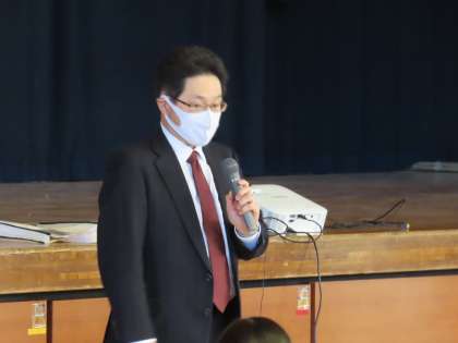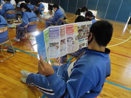 3校目は田方農業高校です。テレビ番組で特集担ったときの映像を見せてくれました。はじめ音が出ないハプニングがありましたが、2年部の先生方の協力で無事見ることができました。農業高校での「大地に学ぶ」が印象に残りました。