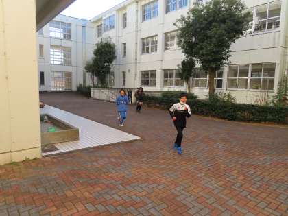 1時間目の体力作りは先輩と同じメニューです。お母さんも教室でのトレーニングや校舎周りも走っていました。一日を楽しんでください。
