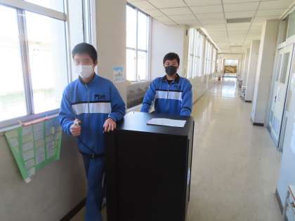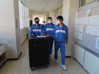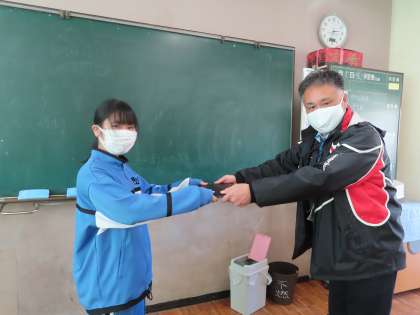 6時間目に校長から生徒代表である、生徒会長の渡邊颯さんへchromebookを貸与しました。教室のモニターにその様子が映し出されていました。写真はちょうど2Aの教室で委員長に渡した様子です。