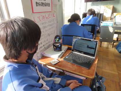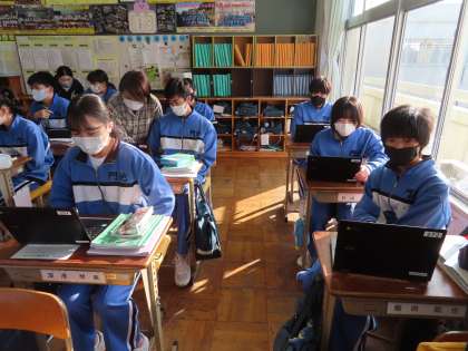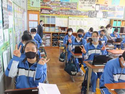 英語の時間chromebookを使って授業をしていました。生徒はうれしそうな顔を浮かべています。