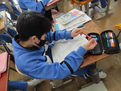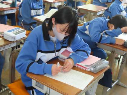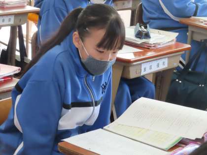 1Aは英語の授業です。「いろいろな疑問文や応答文について理解しよう」の内容です。プリントの疑問文や応答文を読んで理解したらチェックをしています。よりたくさんの文にチェックが入るように頑張っていました。