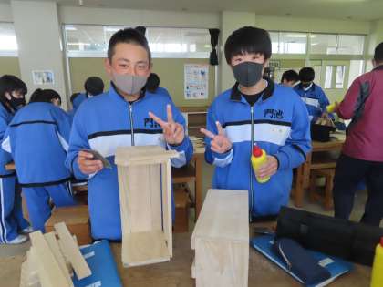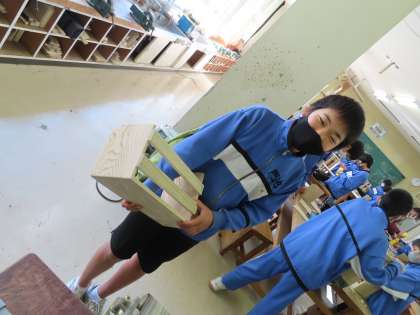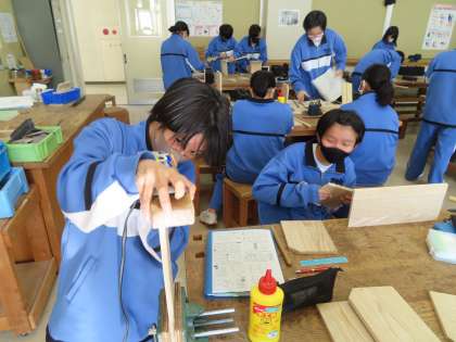 本棚の制作に取り組んでいます。1Cの生徒は作業が早く、もう完成形に近づいている生徒がいます。まだ釘も使っていない生徒も多い中、頑張りました。
