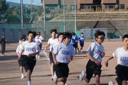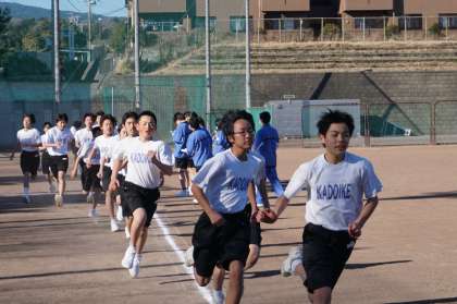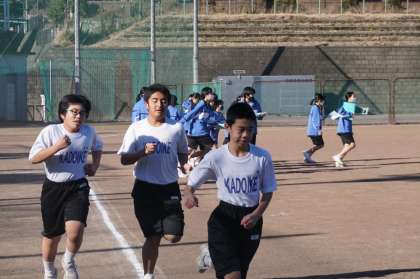 1Cは保体の授業です。長距離走を行います。男子は1500m、女子1000mの記録を計測します。これまでの授業の記録から、「○秒早いよ」「ペースはいいよ」などの声がかけられます。いい記録が出ているようです。