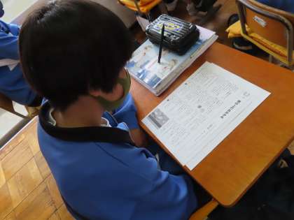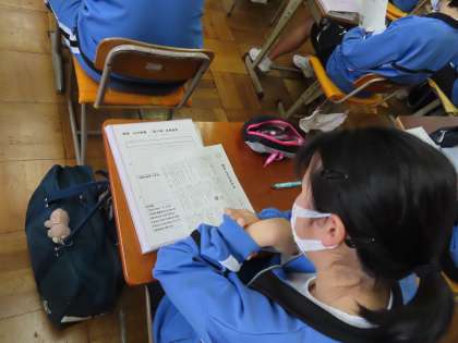今日の1時間目は全校道徳です。先ほども申し上げましたが、体育館でできないため、放送による朗読から始まりました。近藤先生が「橋の上のオオカミ」を朗読しました。