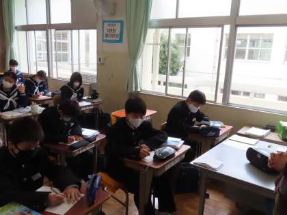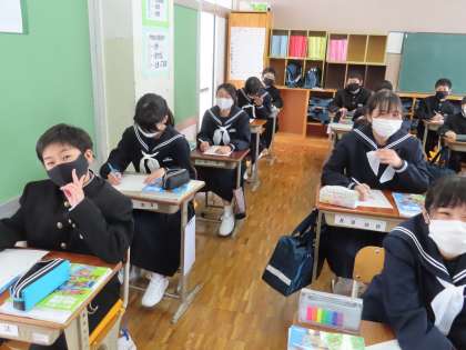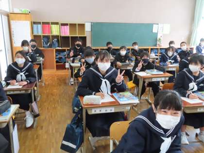 1Cも自己紹介を行っていたようです。矢後先生のいろいろが黒板に書いてありました。今日は生徒の表情を写しました。カメラを向けると「ピース」してくれました。