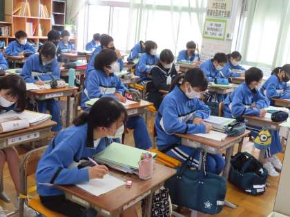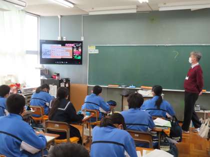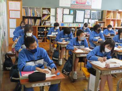 3Dの社会は永井教頭先生です。フォースクールを見て分かったことを書き出しましょう。動画の内容、しかも早口でしたが、生徒はどんどん記入していました。