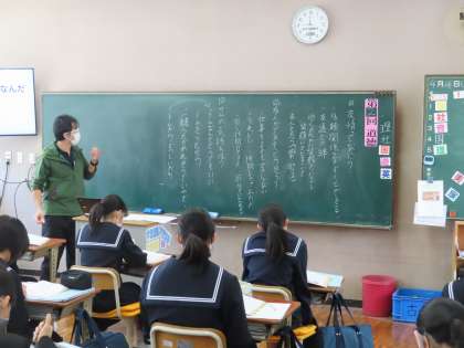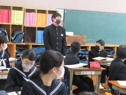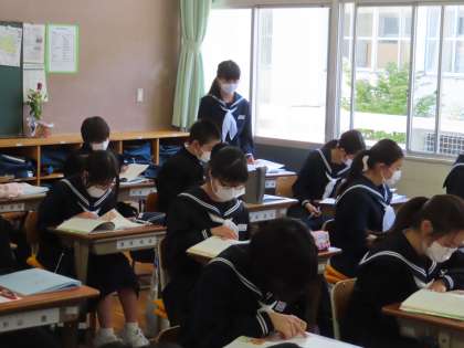 1Cの道徳は栗田先生です。「あるピエロの話」です。友情や信頼について話し合ってから、教科書に入っていきました。普段の自分と比べながら授業が進んでいきました。