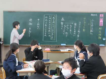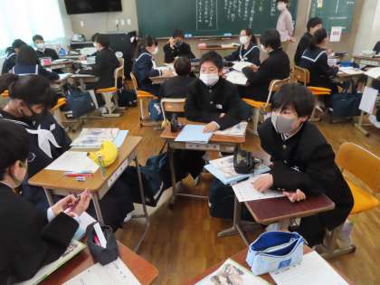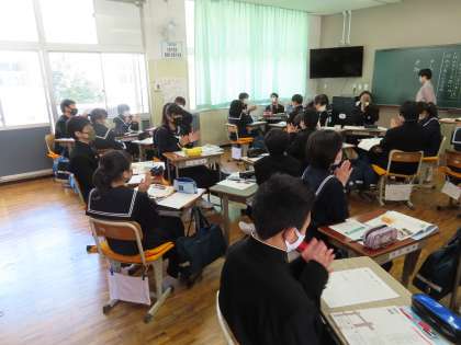 1Dの道徳は矢後先生の授業です。「ふと目の前に」です。班で話し合いを重ねて、班長が意見をまとめて発表です。聴く姿勢ができています。よい考えや自分たちに近いものがあると「拍手」が出てきました。