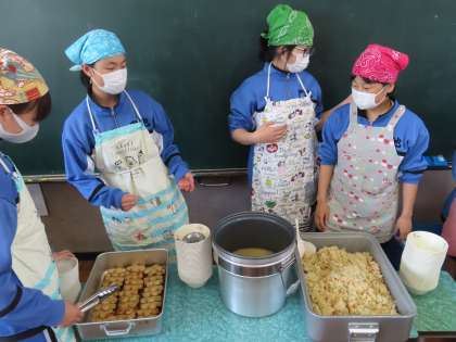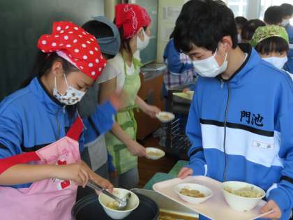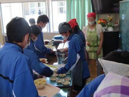 給食当番さんが均等にスープ、ごはん、おかずを分けています。当番の準備ができるまでは読書をしていました。
