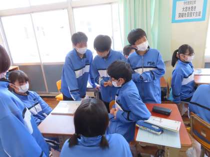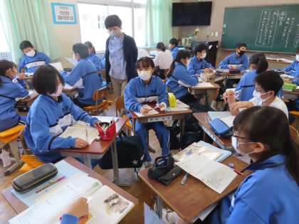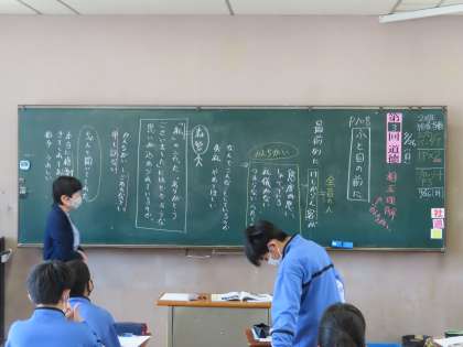 1Aは矢後先生の道徳でした。「ふと目の前に」森重久彌さんのお話です。森重さんの舞台の最前列に「けしからんやつ」がいた。実は全盲の方だったことが分かり勘違いであった。その対応や言葉の重さについて考えています。このような勘違いは、日頃あるかも知れないですね。