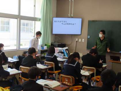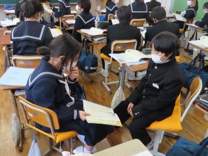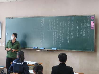 1Dの道徳は栗田先生です。「あるピエロの物語」です。登場人物の気持ちを黒板に書き出し話の内容をまとめていきます。新しい友達ができたそのときの気持ちは・・・素直にうれしいと答える生徒が多かったです。