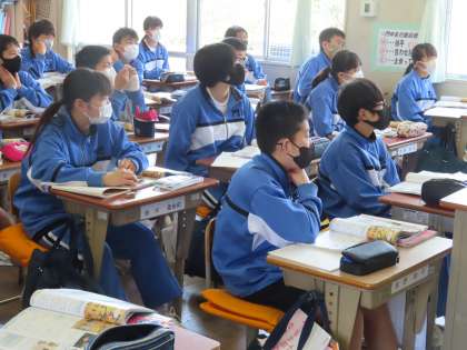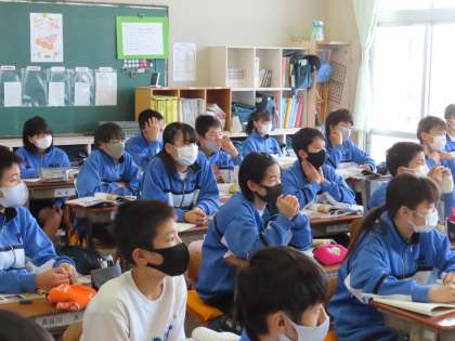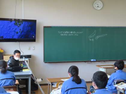 2Aは社会の授業です。「ヨーロッパの人との出会い」をやっていました。種子島になぜ火縄銃が来たのか?TVモニターに地図を映しながら説明していきます。ポルトガル、スペイン、南蛮貿易などキーとなる言葉が出てきて考えていきます。