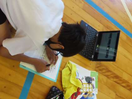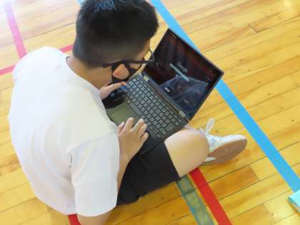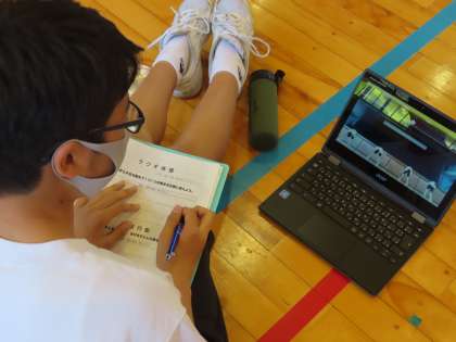 2Cの生徒は是認chromebookを持ってきています。撮影した自分たちの映像をクラスルームにある「2C保体」を選択して映像を見ています。肘や膝の曲げ伸ばしができているかをチェックしていました。