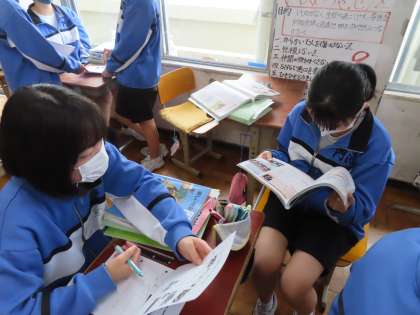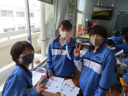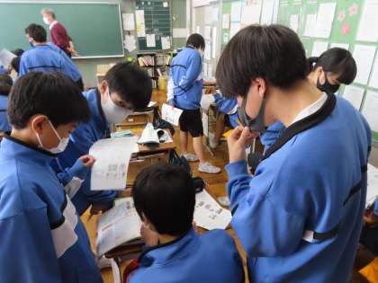 3Dは社会です。永井教頭先生の授業です。「産業革命の進展」を行っています。産業革命ではどんなことが起こっていたのかを、自由に話し合っています。意見を聞き自分の考えをまとめていました。