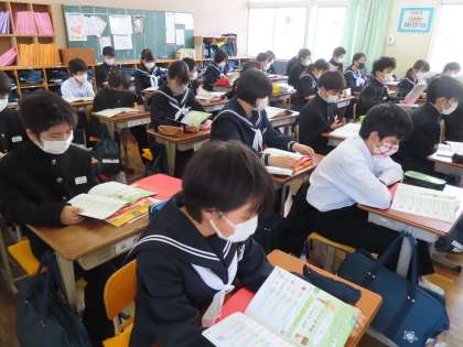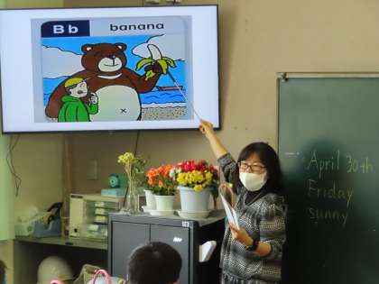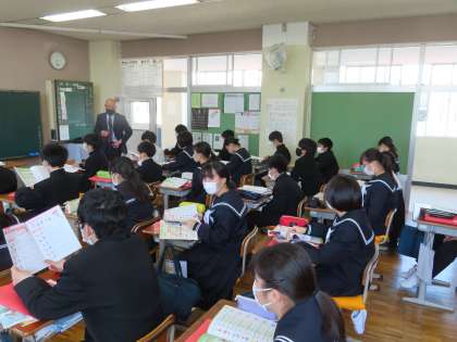 1Aは藤村先生と鈴木先生の英語の授業です。モニターに絵を映しながら発音の練習をしています。唇、舌、息の出し方に注意しながら英語の発音の練習をしていました。